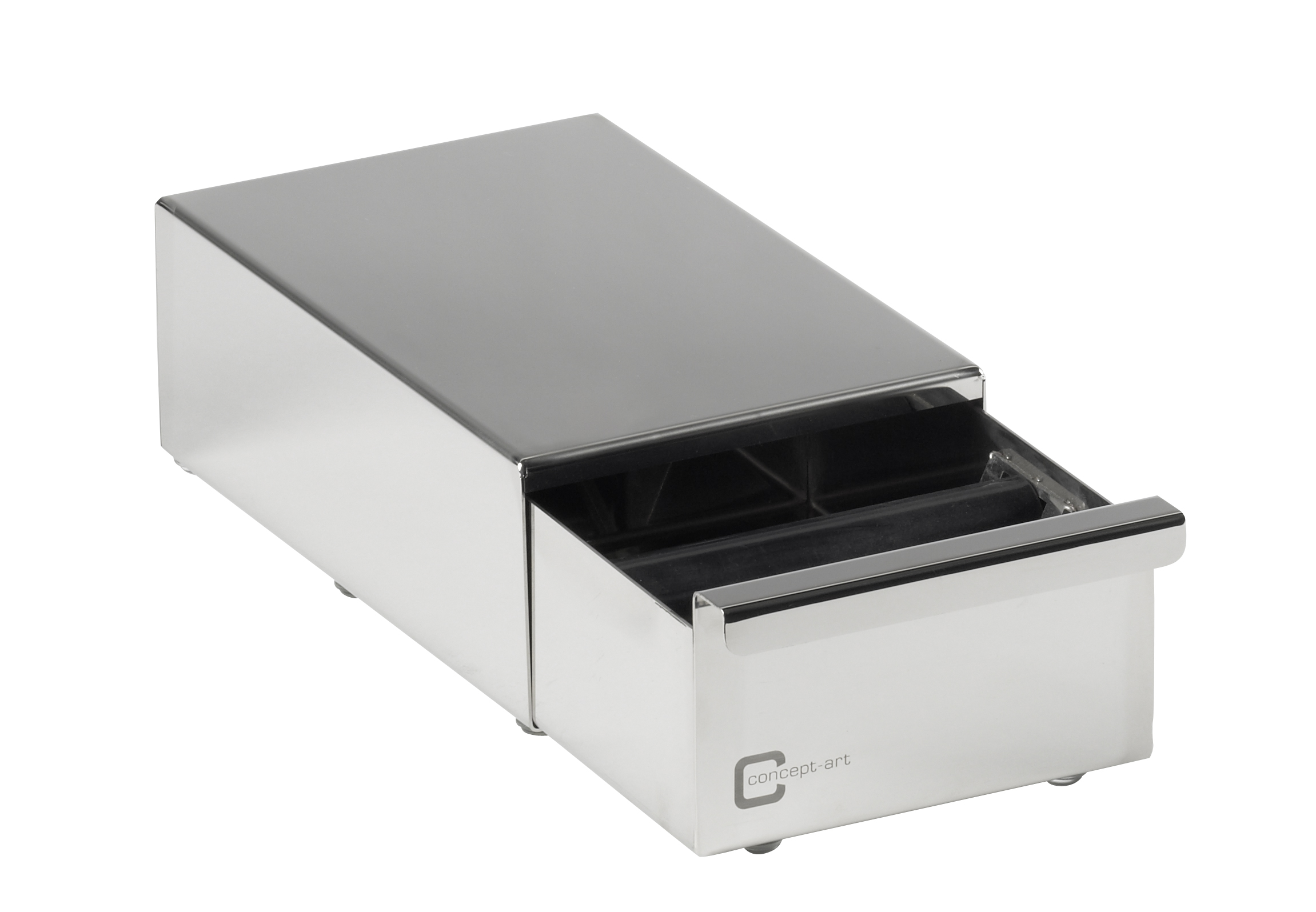 Diese Espresso-Sudschublade aus Edelstahl überzeugt durch Ihr schlichtes Äußeres in der modernen Küche und Ihre Affinität zu den gehobenen Espressomaschinen. Sowohl die Hülle als auch das Innenteil sind komplett aus Edelstahl gefertigt, verschweißt und poliert.