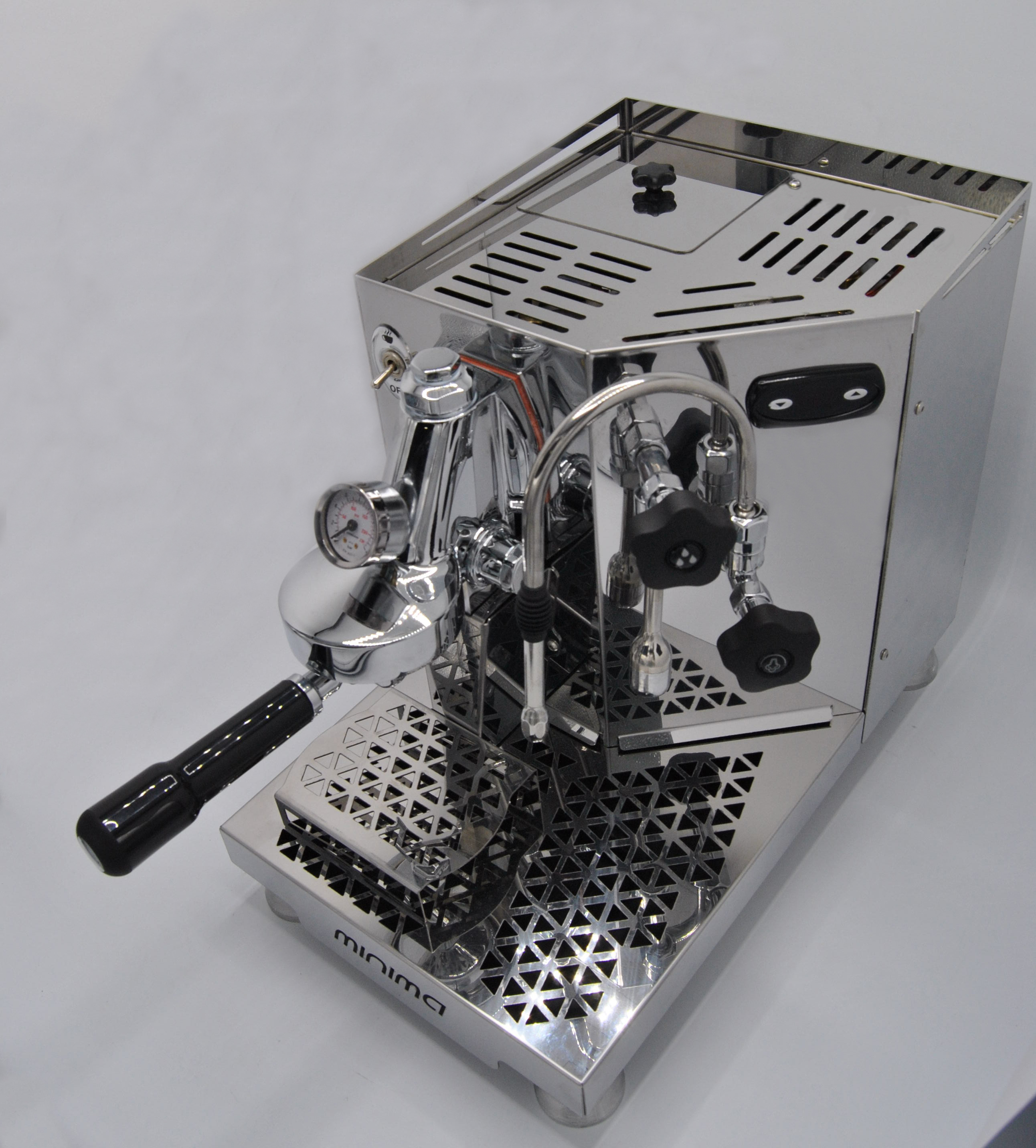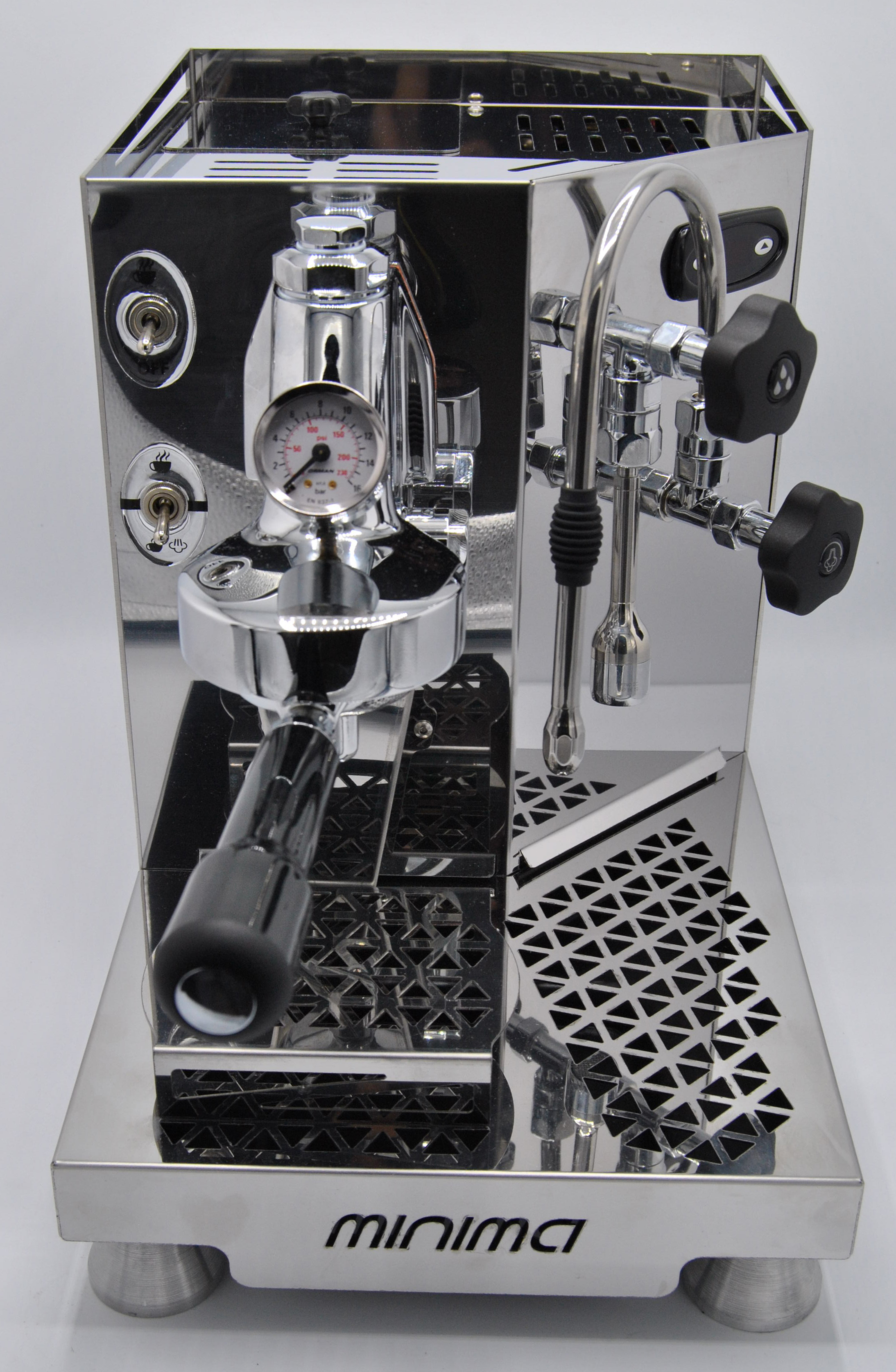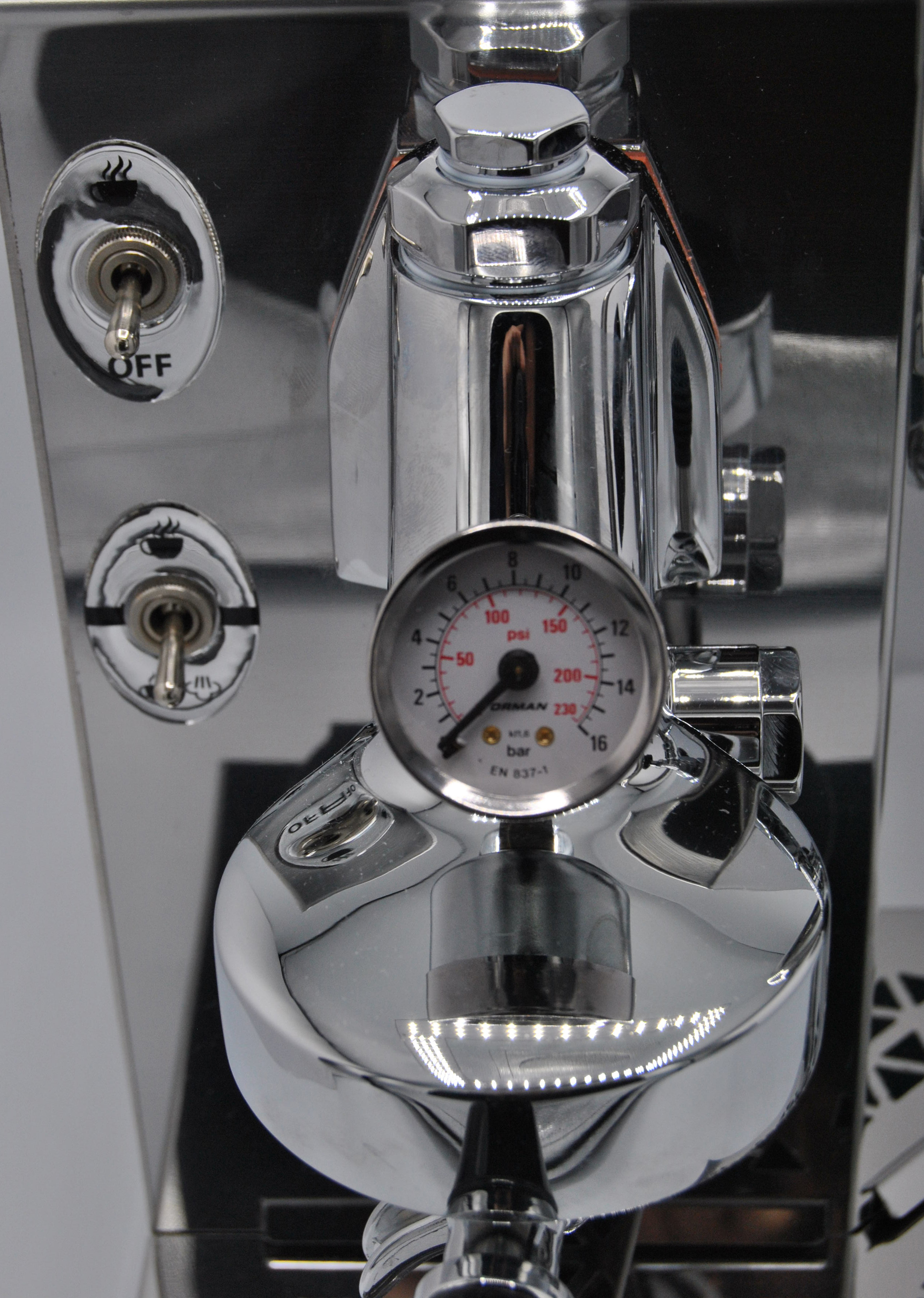 - PID-Regelung mit Anzeige und Manometer mit Doppelskala (Dampfdruck und Pumpendruck), automatischem Füllkessel, Schusszeitgeber und LSP (Last Shot Protection) - Funktion, mit der der Espresso auch bei Erreichen des niedrigen Füllstandes beendet werden kann. Niedriges Hebelsignal.