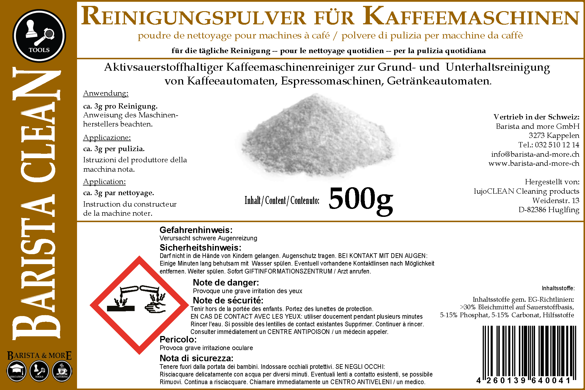 Das Barista-Clean Serie Reinigungspulver wurde speziell konzipiert um sicher und vollständig Kaffeeöle und Fette aus den Brühgruppen von Espressomaschinen zu entfernen.Durch die Verwendung hochwertigster Inhaltsstoffe und modernster Fertigungstechnologien wird eine tadellose Reinigungswirkung erzielt.