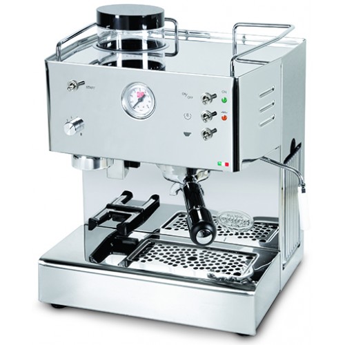 Die kleine Retro-Espressomaschine. Hauptsächlich geeignet für Espresso (geringe Höhe zwischen Siebträger und Abtropfgitter). Die Front und obere Abdeckung bestehen aus Edelstahl und das Gehäuse aus Kunststoff.